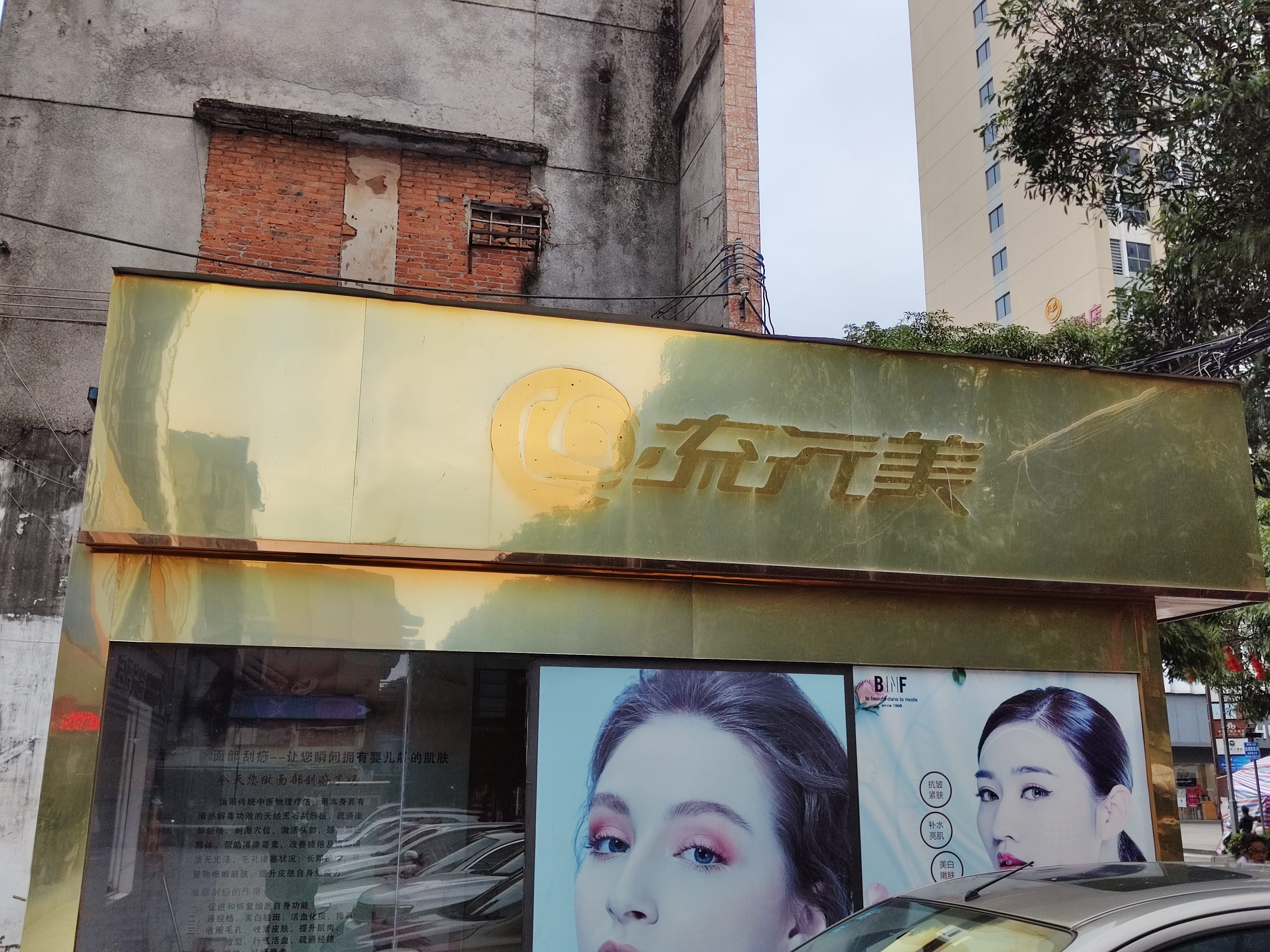 在我印象里,和“哎呀呀”这类小女生饰品店相比,“流行美”是更“成熟”的大姐姐去的地方,这点从标志上的玫瑰花和金色牌子中看出来。现在透过玻璃,看到清空的店面墙上留下的刮痧排毒,似乎变成了中老年女性热爱的养生场所了。