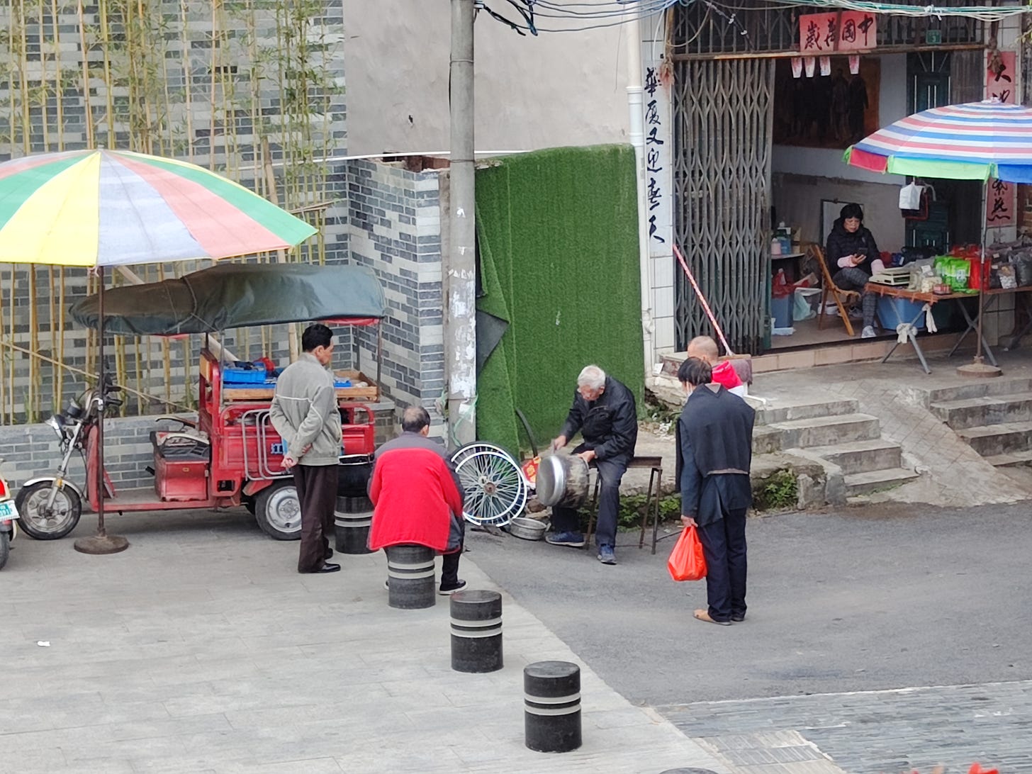 河堤旁向来是钦州最热闹的地方,很多老年人在这里下棋打牌,我去看的时候十之八九都在玩扑克牌,可能在斗地主,这边重新铺好的灰色地砖平整结实。三个大爷在看一位补锅匠补锅,看起来这位上了年纪的补锅匠平时主要帮别人修车,那个电动三轮车上放着他的工具。